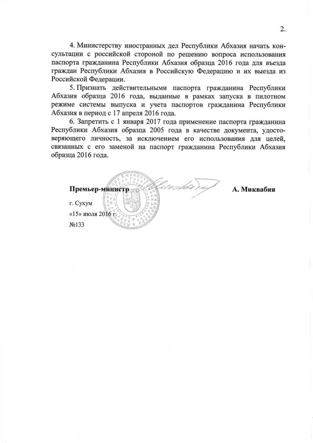 Постановление Кабинета Министров Республики Абхазия от 15.07.2016 № 133 "Об утверждении Положения о паспорте гражданина Республики Абхазия образца 2016 года, образца бланка и его описания"