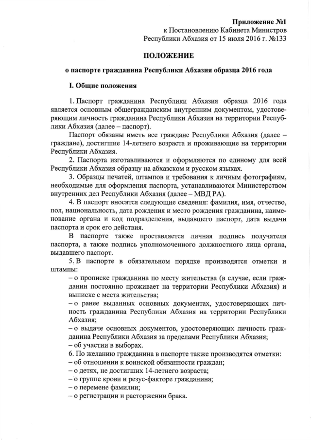Постановление Кабинета Министров Республики Абхазия от 15.07.2016 № 133 "Об утверждении Положения о паспорте гражданина Республики Абхазия образца 2016 года, образца бланка и его описания"