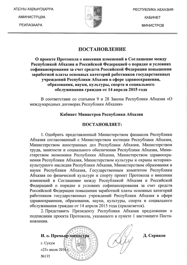 Постановление Кабинета Министров Республики Абхазия от 25.07.2016 № 135 "О проекте Протокола о внесении изменений в Соглашение меяеду Республикой Абхазия и Российской Федерацией о порядке и условиях софинансирования за счет средств Российской Федерации повышения заработной платы основных категорий работников государственных учреждений Республики Абхазия в сфере здравоохранения, образования, науки, культуры, спорта и социального обслуживания граяедан от 14 апреля 2015 года"