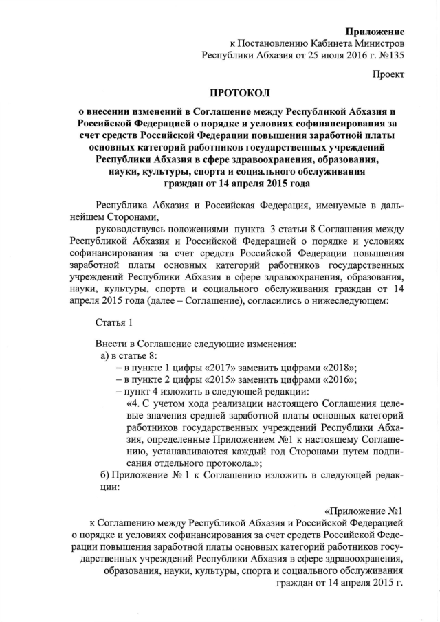 Постановление Кабинета Министров Республики Абхазия от 25.07.2016 № 135 "О проекте Протокола о внесении изменений в Соглашение меяеду Республикой Абхазия и Российской Федерацией о порядке и условиях софинансирования за счет средств Российской Федерации повышения заработной платы основных категорий работников государственных учреждений Республики Абхазия в сфере здравоохранения, образования, науки, культуры, спорта и социального обслуживания граяедан от 14 апреля 2015 года"