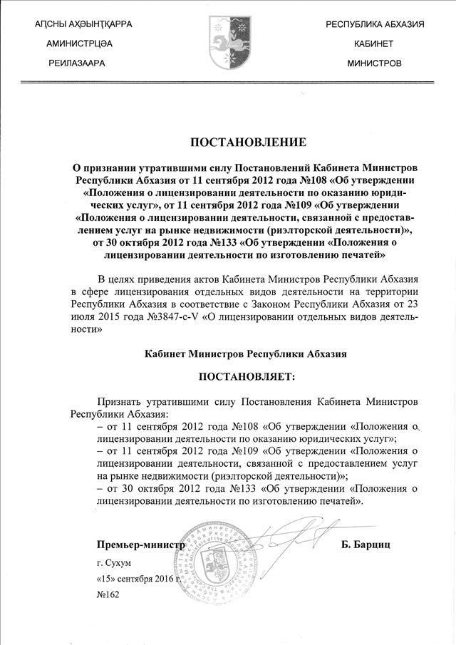 Постановление Кабинета Министров Республики Абхазия от 15.09.2016 № 162 "О признании утратившими силу Постановлений Кабинета Министров Республики Абхазия от 11 сентября 2012 года № 108 "Об утверждении "Положения о лицензировании деятельности по оказанию юридических услуг", от 11 сентября 2012 года № 109 "Об утверждении "Положения о лицензировании деятельности, связанной с предоставлением услуг на рынке недвижимости (риэлторской деятельности)", от 30 октября 2012 года № 133 "Об утверждении "Положения о лицензировании деятельности по изготовлению печатей"