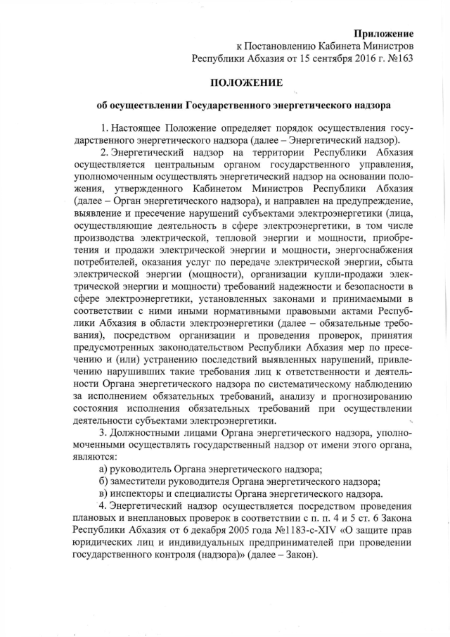 Постановление Кабинета Министров Республики Абхазия от 15.09.2016 № 163 "Об утверждении "Положения об осуществлении государственного энергетического надзора"