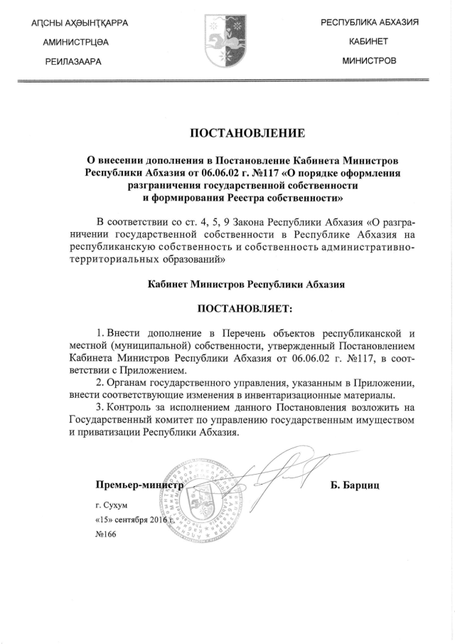 Постановление Кабинета Министров Республики Абхазия от 15.09.2016 № 166 "О внесении дополнения в Постановление Кабинета Министров Республики Абхазия от 06.06.02 г. № 117 "О порядке оформления разграничения государственной собственности и формирования Реестра собственности"