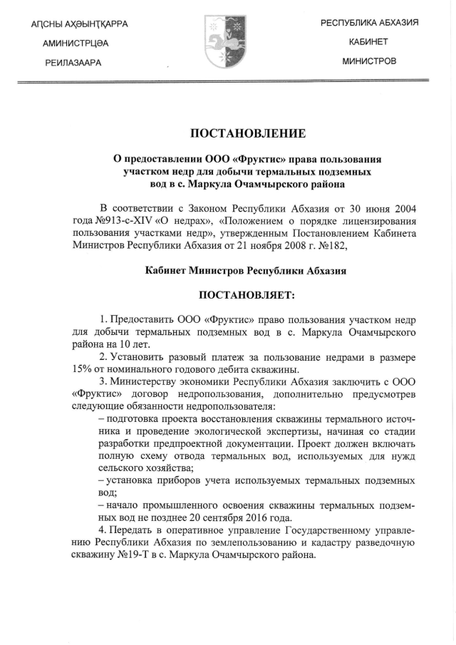 Постановление Кабинета Министров Республики Абхазия от 15.09.2016 № 167 "О предоставлении ООО "Фруктис" права пользования участком недр для добычи термальных подземных вод в с. Маркула Очамчырского района"