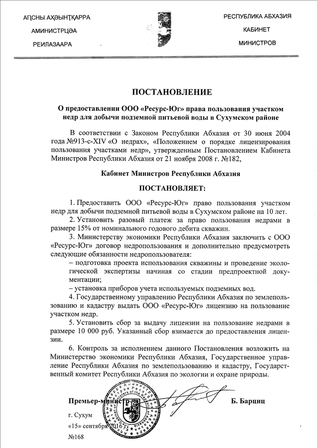 Постановление Кабинета Министров Республики Абхазия от 15.09.2016 № 168 "О предоставлении ООО "Ресурс-Юг" права пользования участком недр для добычи подземной питьевой воды в Сухумском районе"
