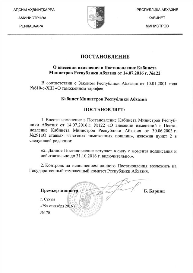 Постановление Кабинета Министров Республики Абхазия от 29.09.2016 № 170 "О внесении изменения в Постановление Кабинета Министров Республики Абхазия от 14.07.2016 г. № 122"
