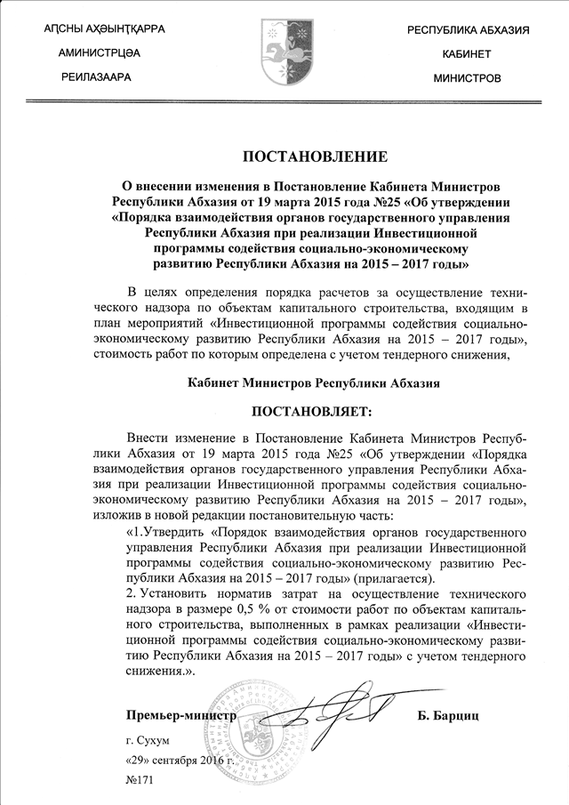 Постановление Кабинета Министров Республики Абхазия от 29.09.2016 № 171 "О внесении изменения в Постановление Кабинета Министров Республики Абхазия от 19 марта 2015 года № 25 "Об утверждении "Порядка взаимодействия органов государственного управления Республики Абхазия при реализации Инвестиционной программы содействия социально-экономическому развитию Республики Абхазия на 2015-2017 годы"