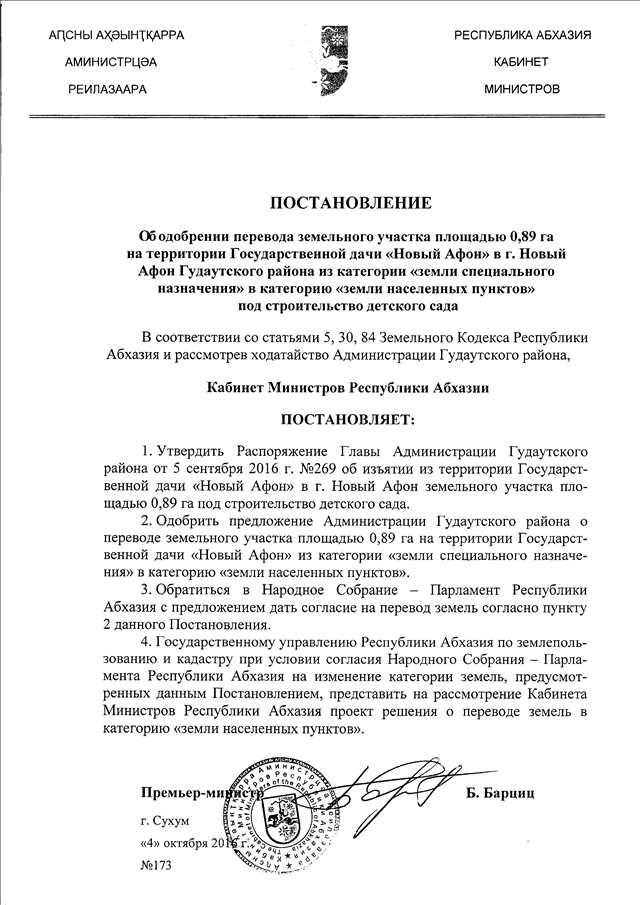 Постановление Кабинета Министров Республики Абхазия от 04.10.2016 № 173 "Об одобрении перевода земельного участка площадью 0,89 га на территории Государственной дачи "Новый Афон" в г. Новый Афон Гудаутского района из категории "земли специального назначения" в категорию "земли населенных пунктов" под строительство детского сада"