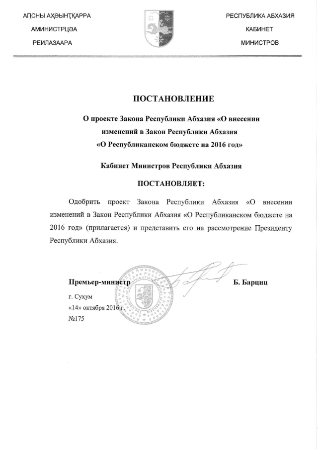 Постановление Кабинета Министров Республики Абхазия от 14.10.2016 № 175 "О проекте Закона Республики Абхазия "О внесении изменений в Закон Республики Абхазия "О Республиканском бюджете на 2016 год"
