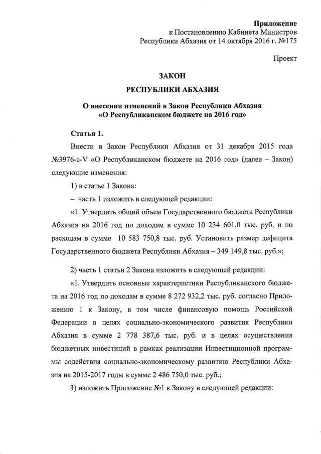 Постановление Кабинета Министров Республики Абхазия от 14.10.2016 № 175 "О проекте Закона Республики Абхазия "О внесении изменений в Закон Республики Абхазия "О Республиканском бюджете на 2016 год"