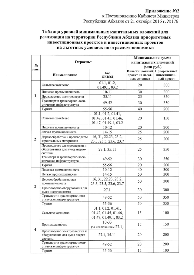 Постановление Кабинета Министров Республики Абхазия от 21.10.2016 № 176 "Об установлении зонирования территории Республики Абхазия для целей присвоения инвестиционным проектам статуса преференциальных"