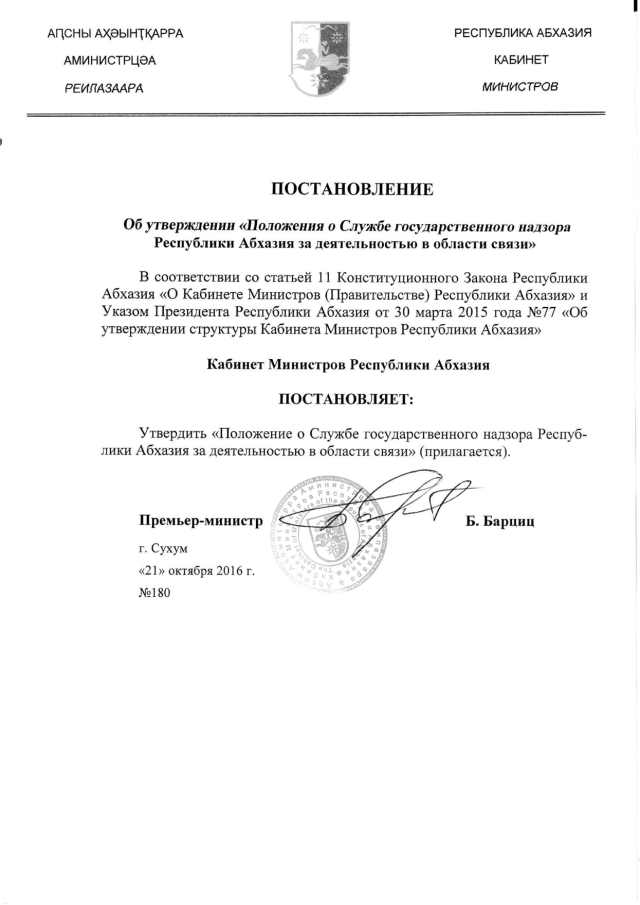 Постановление Кабинета Министров Республики Абхазия от 21.10.2016 № 180 "Об утверждении "Положения о Службе государственного надзора Республики Абхазия за деятельностью в области связи"