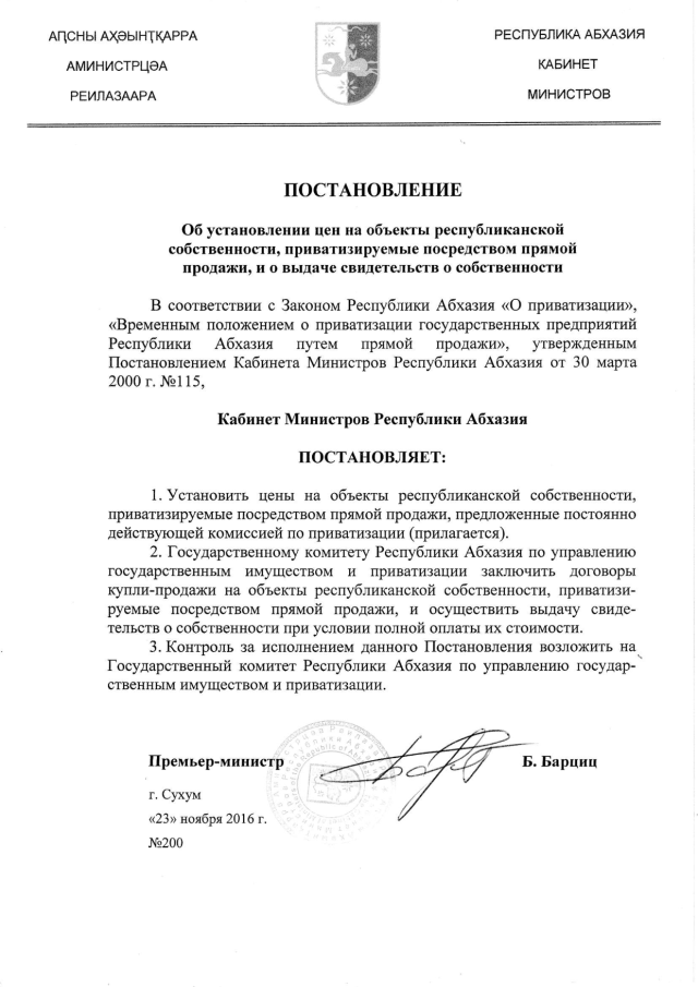 Постановление Кабинета Министров Республики Абхазия от 23.11.2016 № 200 "Об установлении цен на объекты республиканской собственности, приватизируемые посредством прямой продажи, и о выдаче свидетельств о собственности"