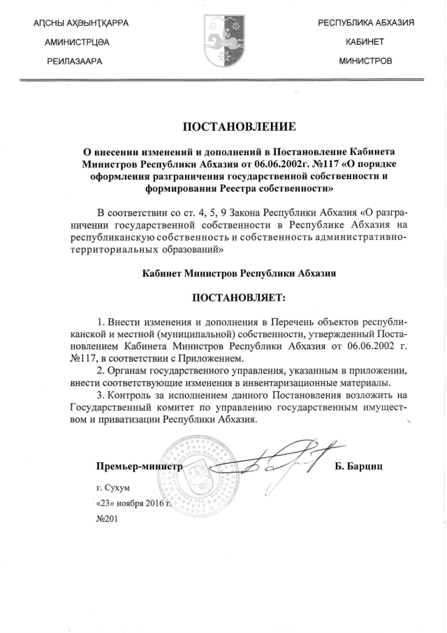 Постановление Кабинета Министров Республики Абхазия от 23.11.2016 № 201 "О внесении изменений и дополнений в Постановление Кабинета Министров Республики Абхазия от 06.06.2002г. № 117 "О порядке оформления разграничения государственной собственности и формирования Реестра собственности"