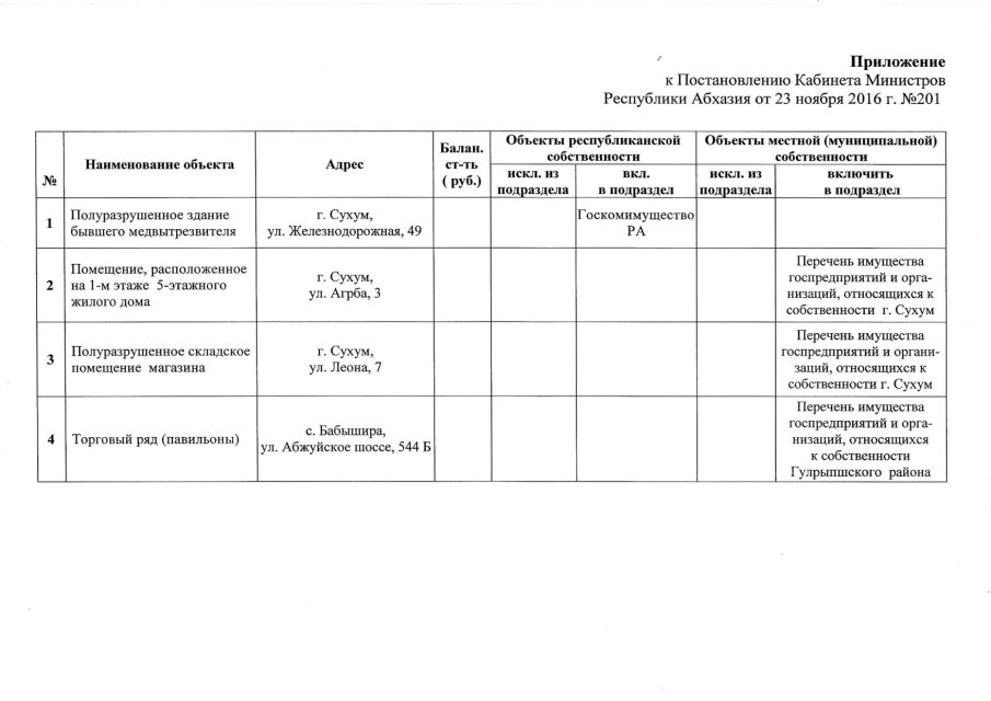 Постановление Кабинета Министров Республики Абхазия от 23.11.2016 № 201 "О внесении изменений и дополнений в Постановление Кабинета Министров Республики Абхазия от 06.06.2002г. № 117 "О порядке оформления разграничения государственной собственности и формирования Реестра собственности"
