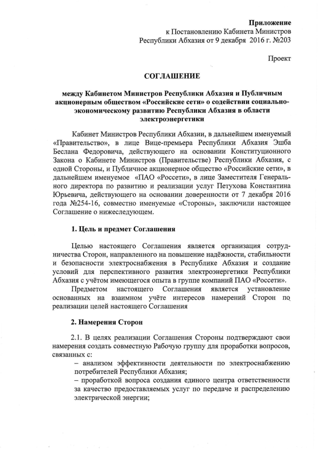 Постановление Кабинета Министров Республики Абхазия от 09.12.2016 № 203 "О проекте "Соглашения между Кабинетом Министров Республики Абхазия и Публичным акционерным обществом "Российские сети" о содействии социально-экономическому развитию Республики Абхазия в области электроэнергетики"
