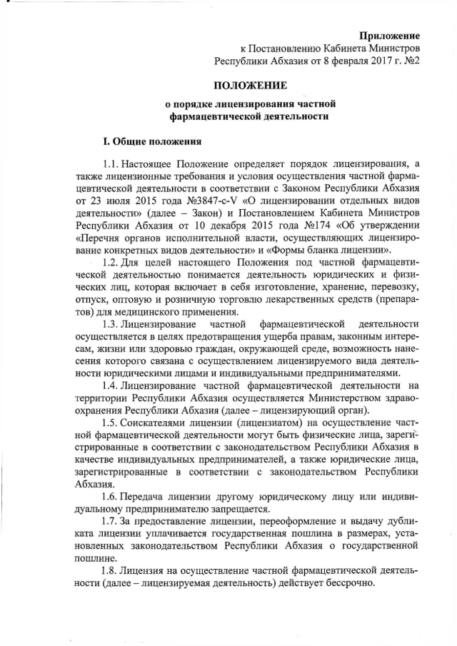 Постановление Кабинета Министров Республики Абхазия от 08.02.2017 № 2 "Об утверждении "Положения о порядке лицензирования частной фармацевтической деятельности"