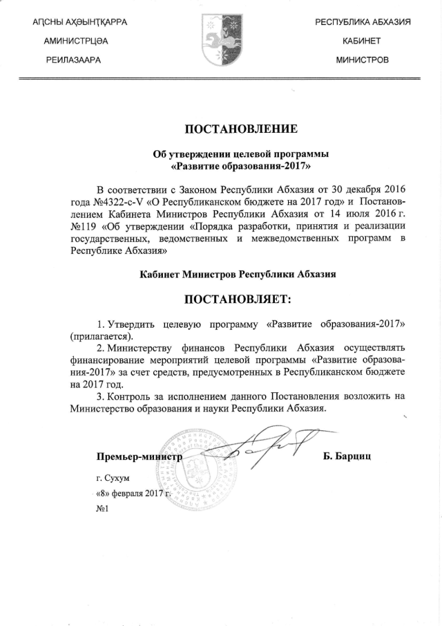 Постановление Кабинета Министров Республики Абхазия от 08.02.2017 № 1 "Об утверждении целевой программы "Развитие образования-2017"