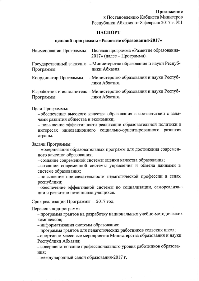 Постановление Кабинета Министров Республики Абхазия от 08.02.2017 № 1 "Об утверждении целевой программы "Развитие образования-2017"