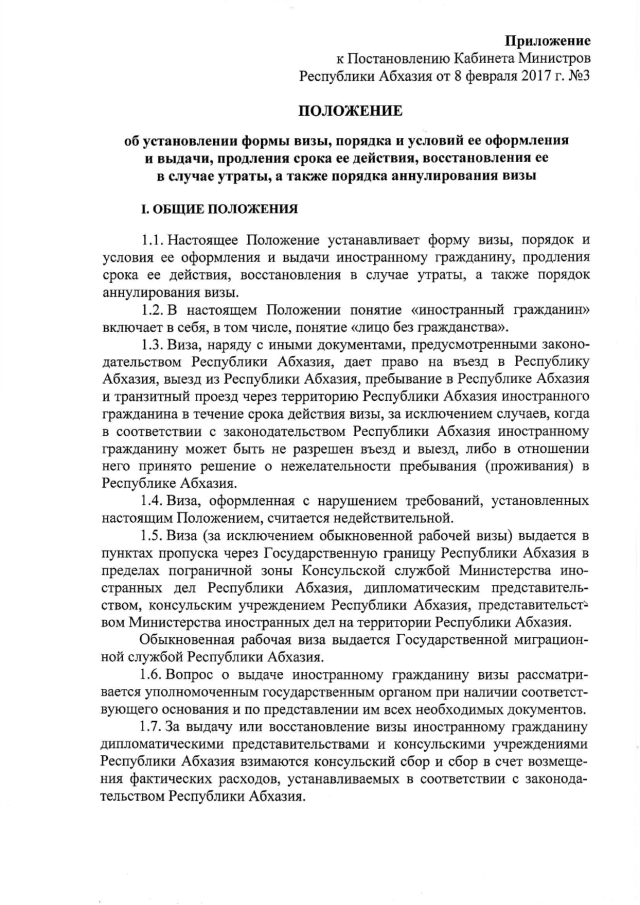 Постановление Кабинета Министров Республики Абхазия от 08.02.2017 № 3 "Об утверждении "Положения об установлении формы визы, порядка и условий ее оформления и выдачи, продления срока ее действия, восстановления ее в случае утраты, а также порядка аннулирования визы"