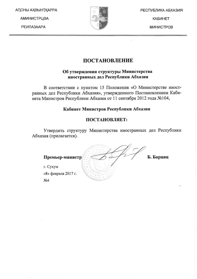 Постановление Кабинета Министров Республики Абхазия от 08.02.2017 № 4 "Об утверждении структуры Министерства иностранных дел Республики Абхазия"
