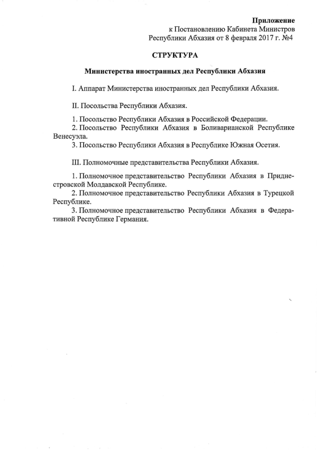 Постановление Кабинета Министров Республики Абхазия от 08.02.2017 № 4 "Об утверждении структуры Министерства иностранных дел Республики Абхазия"