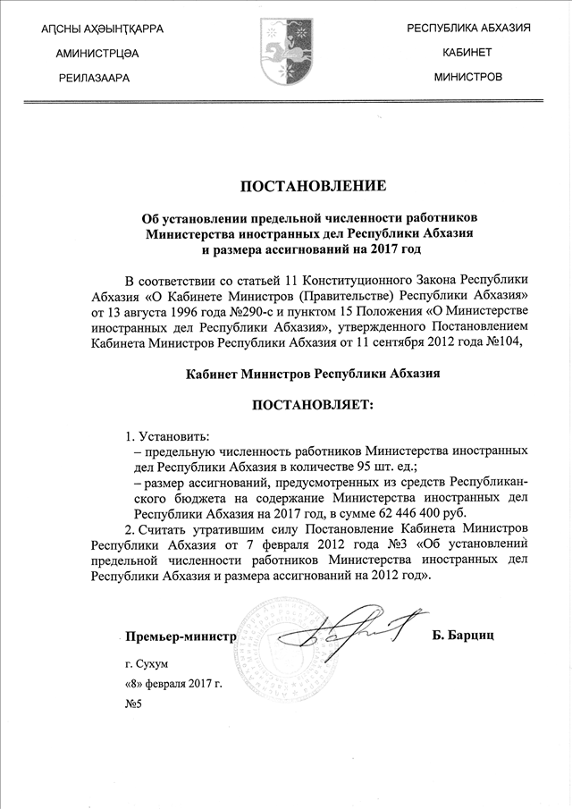 Постановление Кабинета Министров Республики Абхазия от 08.02.2017 № 5 "Об установлении предельной численности работников Министерства иностранных дел Республики Абхазия и размера ассигнований на 2017 год"