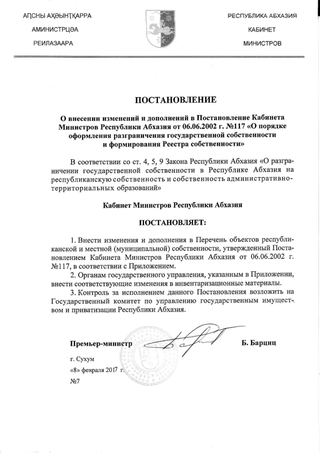 Постановление Кабинета Министров Республики Абхазия от 08.02.2017 № 7 "О внесении изменений и дополнений в Постановление Кабинета Министров Республики Абхазия от 06.06.2002 г. № 117 "О порядке оформления разграничения государственной собственности и формирования Реестра собственности"