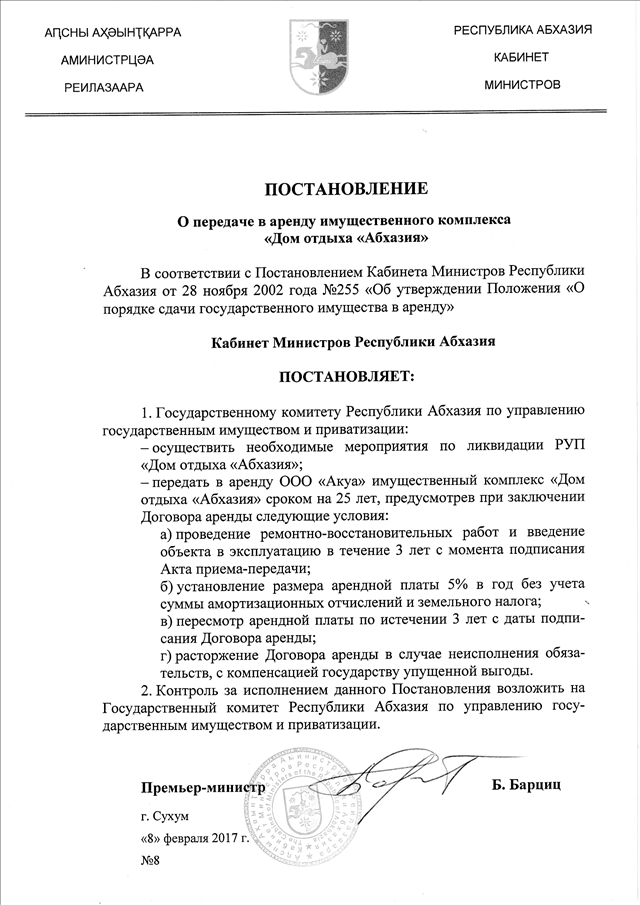 Постановление Кабинета Министров Республики Абхазия от 08.02.2017 № 8 "О передаче в аренду имущественного комплекса "Дом отдыха "Абхазия"