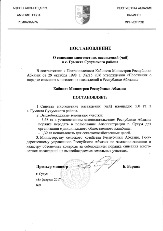 Постановление Кабинета Министров Республики Абхазия от 08.02.2017 № 9 "О списании многолетних насаждений (чай) в с. Гумиста Сухумского района"