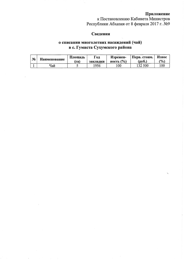 Постановление Кабинета Министров Республики Абхазия от 08.02.2017 № 9 "О списании многолетних насаждений (чай) в с. Гумиста Сухумского района"