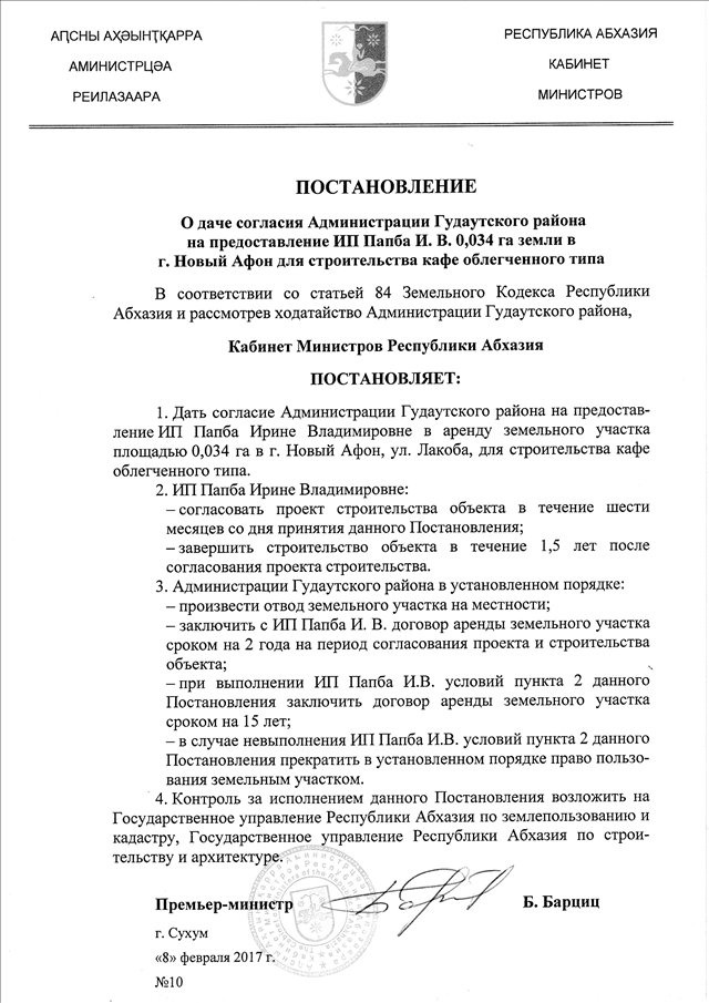 Постановление Кабинета Министров Республики Абхазия от 08.02.2017 № 10 "О даче согласия Администрации Гудаутского района на предоставление ИП Папба И. В. 0,034 га земли в г. Новый Афон для строительства кафе облегченного типа"