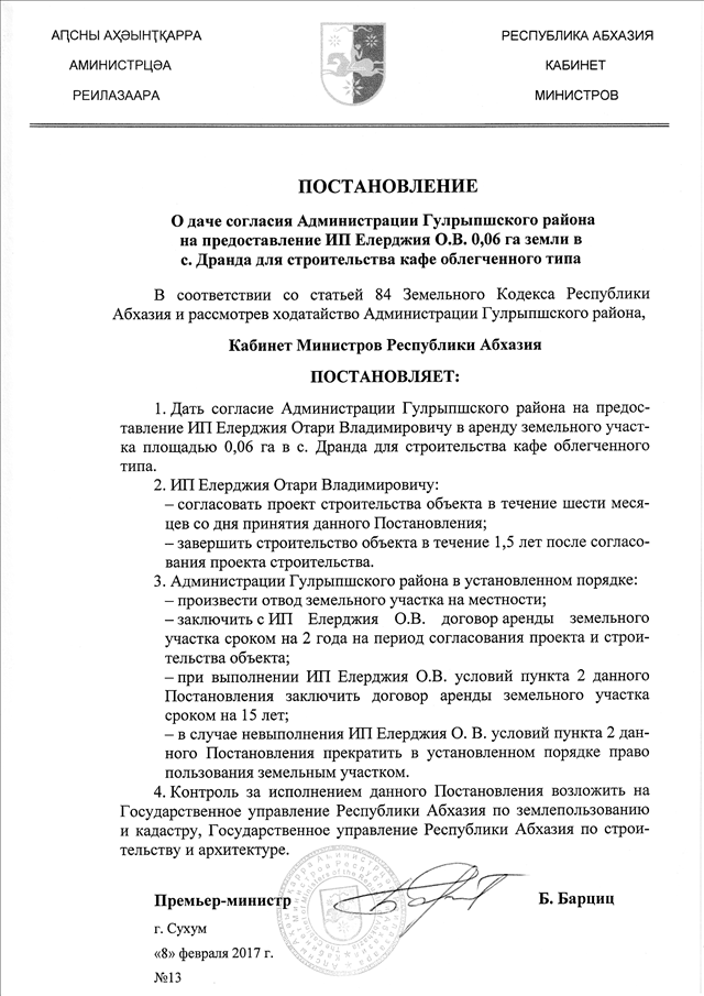 Постановление Кабинета Министров Республики Абхазия от 08.02.2017 № 13 "О даче согласия Администрации Гулрыпшского района на предоставление ИП Елерджия О.В. 0,06 га земли в с. Дранда для строительства кафе облегченного типа"