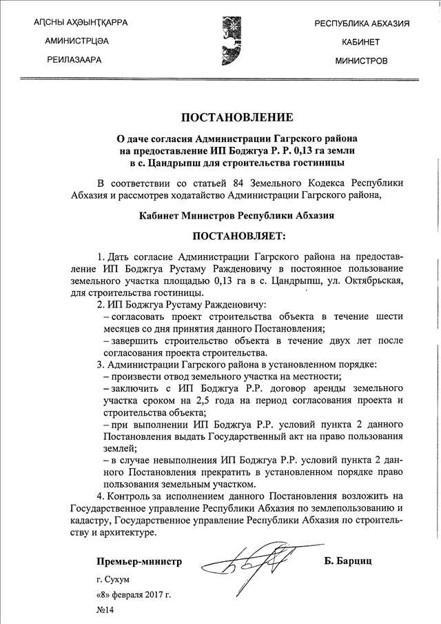 Постановление Кабинета Министров Республики Абхазия от 08.02.2017 № 14 "О даче согласия Администрации Гагрского района на предоставление ИП Боджгуа Р.Р. 0,13 га земли в с. Цандрыпш для строительства гостиницы"