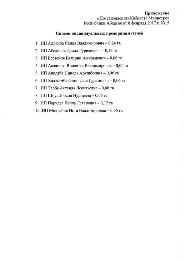 Постановление Кабинета Министров Республики Абхазия от 08.02.2017 № 15 "О даче согласия Администрации Гулрыпшского района на предоставление индивидуальным предпринимателям земельных участков в с. Бабышира для строительства курортнооздоровительных объектов (туристические гостиницы)"