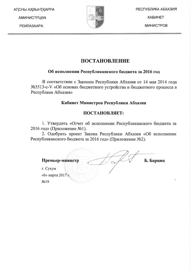 Постановление Кабинета Министров Республики Абхазия от 06.03.2017 № 19 "Об исполнении Республиканского бюджета за 2016 год"