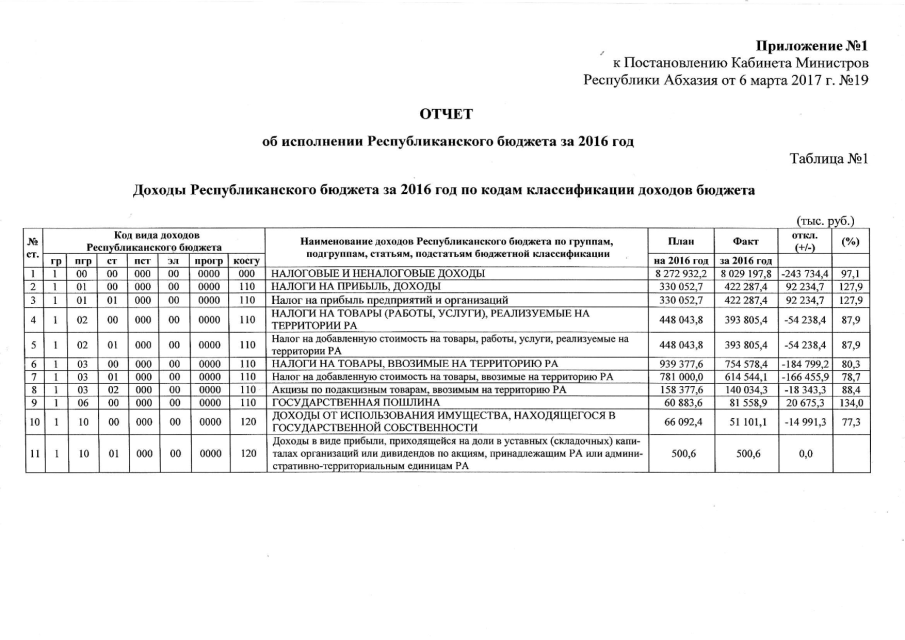 Постановление Кабинета Министров Республики Абхазия от 06.03.2017 № 19 "Об исполнении Республиканского бюджета за 2016 год"
