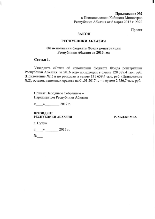 Постановление Кабинета Министров Республики Абхазия от 06.03.2017 № 22 "Об исполнении бюджета Фонда репатриации Республики Абхазия за 2016 год"