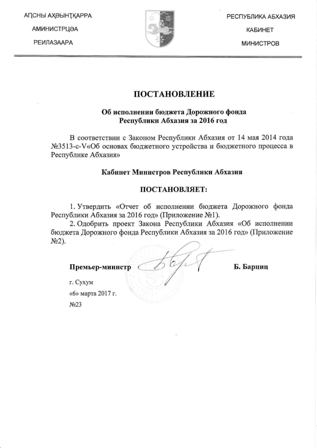 Постановление Кабинета Министров Республики Абхазия от 06.03.2017 № 23 "Об исполнении бюджета Дорожного фонда Республики Абхазия за 2016 год"