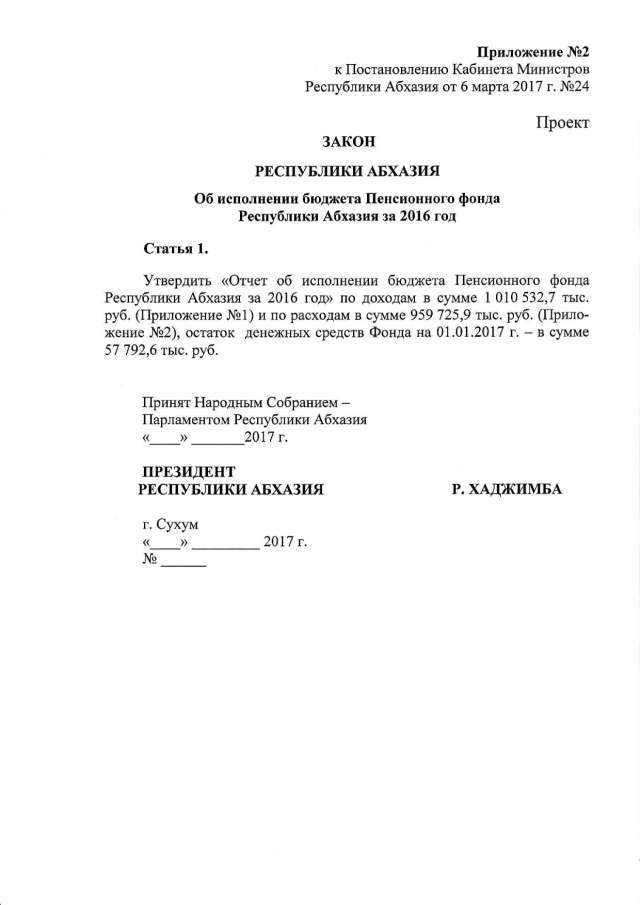 Постановление Кабинета Министров Республики Абхазия от 06.03.2017 № 24 "Об исполнении бюджета Пенсионного фонда Республики Абхазия за 2016 год"