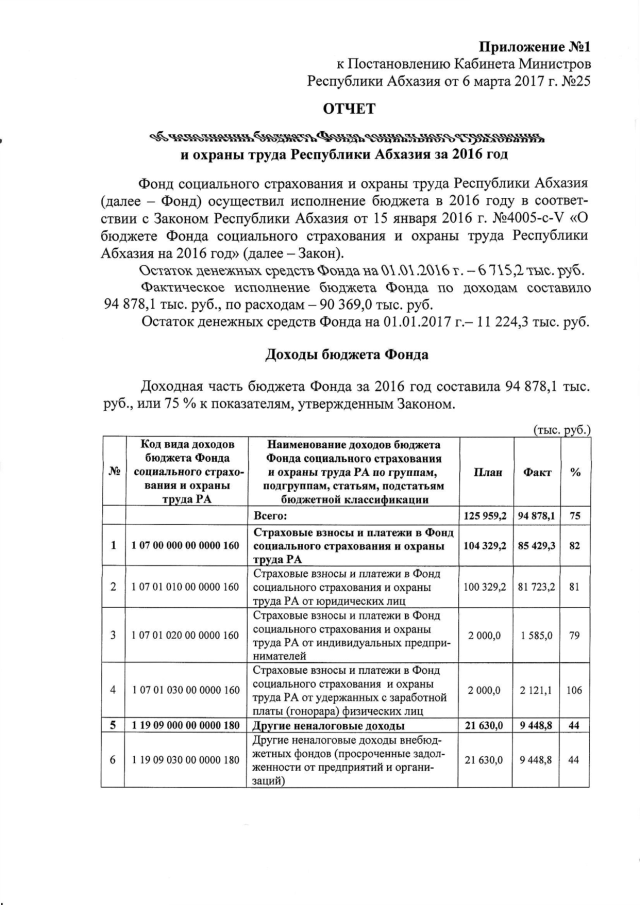 Постановление Кабинета Министров Республики Абхазия от 06.03.2017 № 25 "Об исполнении бюджета Фонда социального страхования и охраны труда Республики Абхазия за 2016 год"
