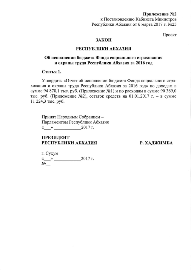 Постановление Кабинета Министров Республики Абхазия от 06.03.2017 № 25 "Об исполнении бюджета Фонда социального страхования и охраны труда Республики Абхазия за 2016 год"