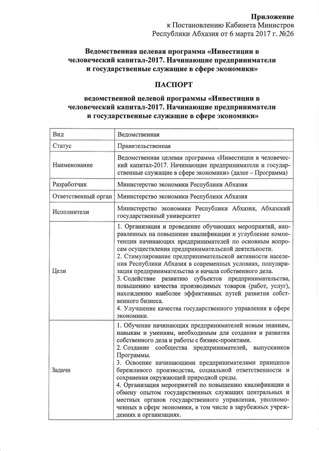 Постановление Кабинета Министров Республики Абхазия от 06.03.2017 № 26 "Об утверждении ведомственной целевой программы "Инвестиции в человеческий капитал-2017. Начинающие предприниматели и государственные служащие в сфере экономики"