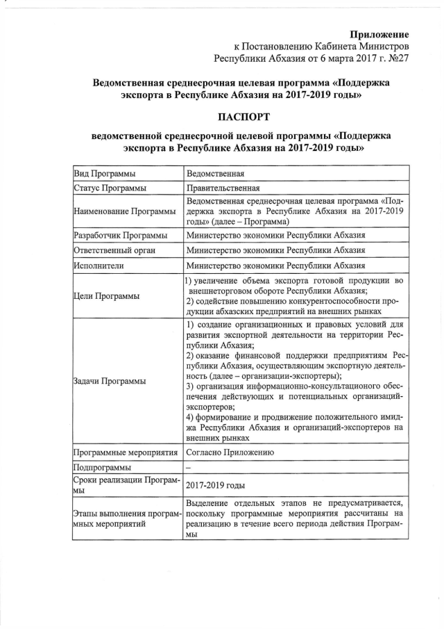 Постановление Кабинета Министров Республики Абхазия от 06.03.2017 № 27 "Об утверждении ведомственной среднесрочной целевой программы "Поддержка экспорта в Республике Абхазия на 2017-2019 годы"