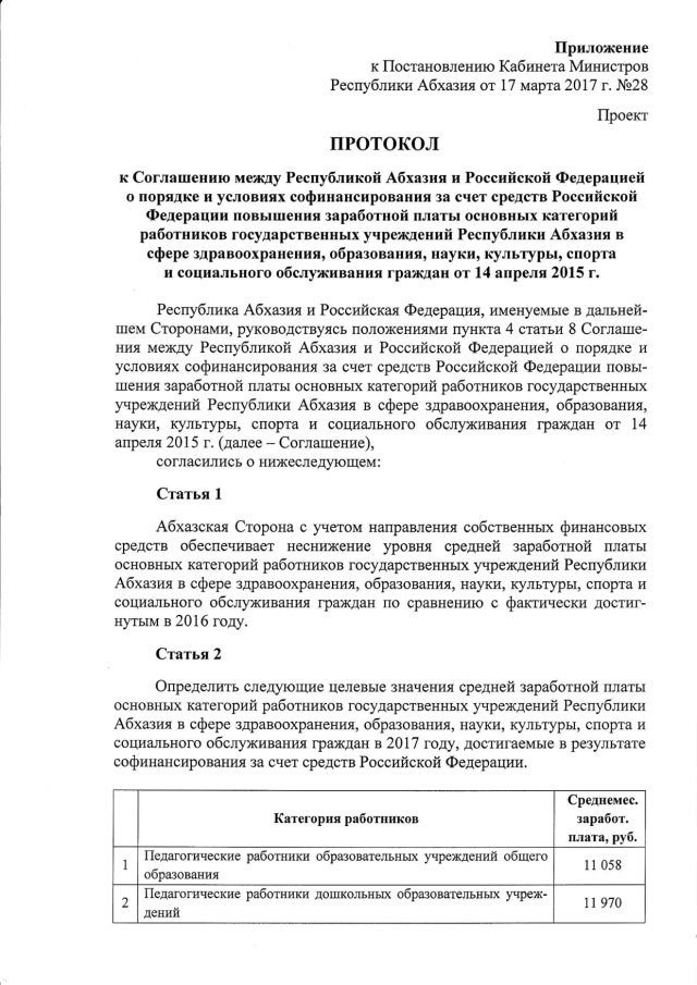 Постановление Кабинета Министров Республики Абхазия от 17.03.2017 № 28 "О проекте Протокола к Соглашению между Республикой Абхазия и Российской Федерацией о порядке и условиях софинансирования за счет средств Российской Федерации повышения заработной платы основных категорий работников государственных учреждений Республики Абхазия в сфере здравоохранения, образования, науки, культуры, спорта и социального обслуживания граждан от 14 апреля 2015 года"