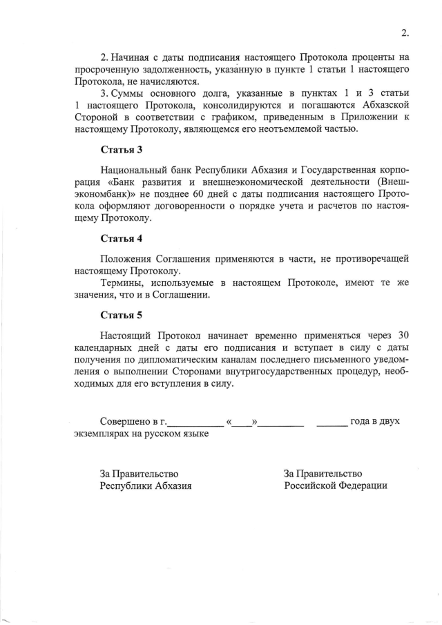 Постановление Кабинета Министров Республики Абхазия от 17.03.2017 № 29 "Об утверждении проекта Протокола № 2 к Соглашению между Правительством Республики Абхазия и Правительством Российской Федерации о предоставлении Правительству Республики Абхазия государственного экспортного кредита от 24 декабря 2010 года"