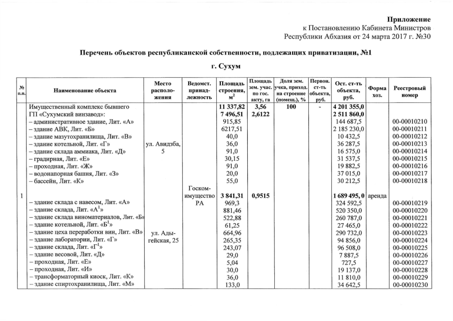 Постановление Кабинета Министров Республики Абхазия от 24.03.2017 № 30 "О Перечне объектов республиканской собственности, подлежащих приватизации"