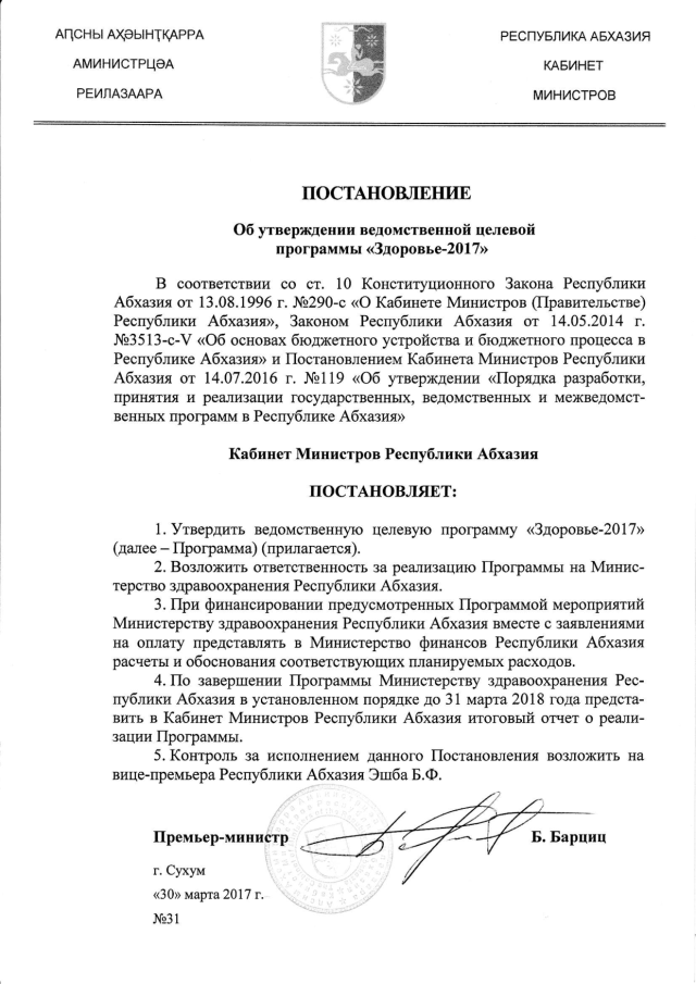 Постановление Кабинета Министров Республики Абхазия от 30.03.2017 № 31 "Об утверждении ведомственной целевой программы "Здоровье-2017"
