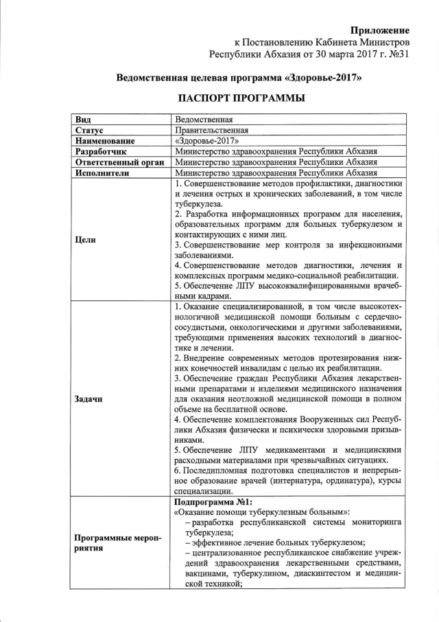 Постановление Кабинета Министров Республики Абхазия от 30.03.2017 № 31 "Об утверждении ведомственной целевой программы "Здоровье-2017"