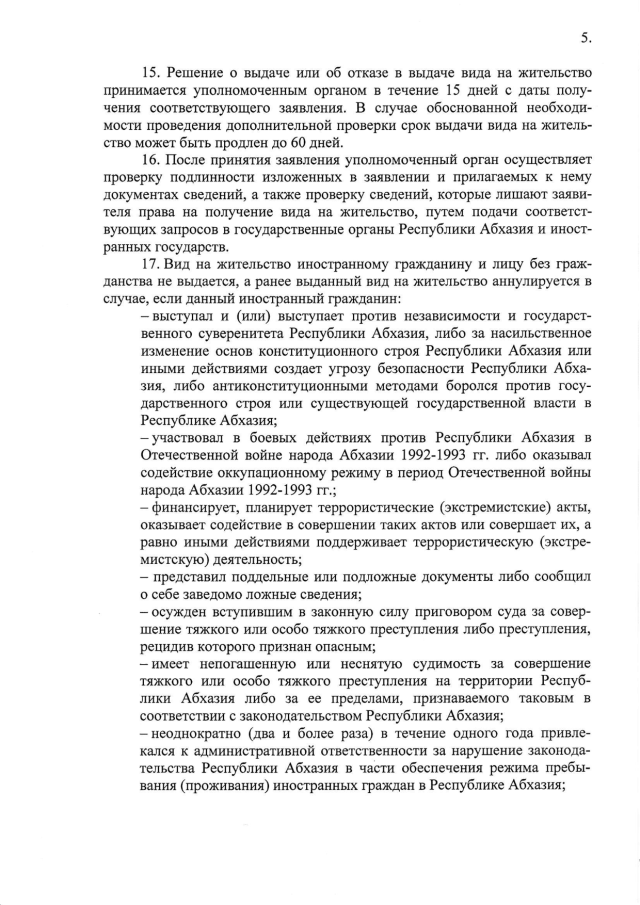 Постановление Кабинета Министров Республики Абхазия от 30.03.2017 № 33 "Об утверждении формы бланка документальной книжки вида на жительство Республики Абхазия и его описания, порядка выдачи или продления срока действия вида на жительство Республики Абхазия и формы заявления о выдаче или продлении срока действия вида на жительство Республики Абхазия"